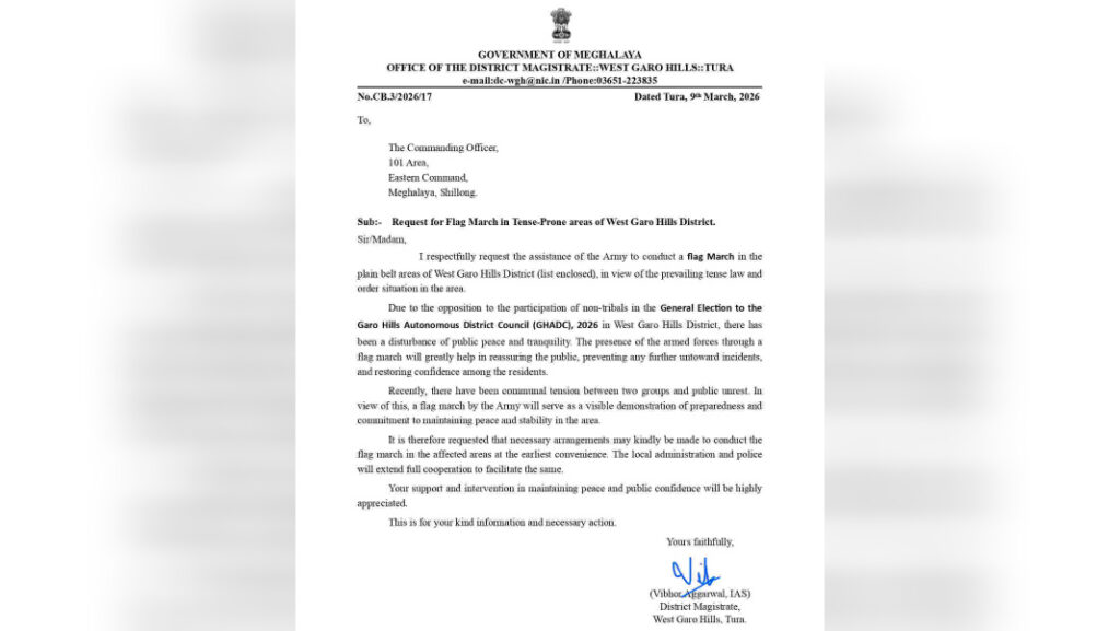 Ha ka shithi sha u Commanding Officer ka 101 Area, Eastern Command, u Vibhor ula ong “Nga kyrpad da kaba burom ia ka jingiarap lem ki shipai ban pynlong ia ka ‘flag march’ ( iaid pahara) ha ki jaka them jong ka West Garo Hills, namar ka jingthut ka shongsuk shongsain ha ka thain”.