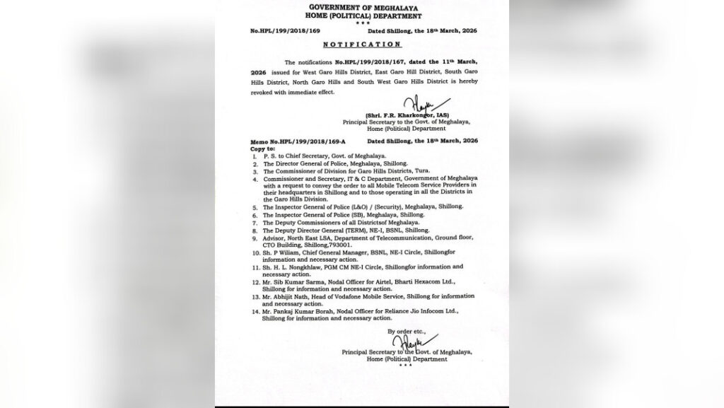 Shillong, Lber 18: Ka tnad Home (Political) ka sorkar Meghalaya kala pynmih ia ka jingpynbna ba kala weng noh ia ka jingkhang ia ka kor Internet ne Mobile Internet Data ha ka rilum Garo.
