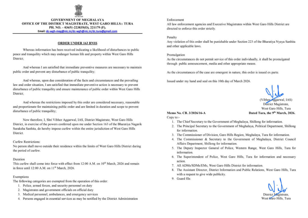 Ia kane ka hukum la pynmih da u Vibhor Aggarwal, District Magistrate ka West Garo Hills ha ka sngi Ba-ar hapoh ka kyndon 163 jong ka Bharatiya Nagarik Suraksha Sanhita (BNSS), 2023, kaba long ruh hadien ki khubor ba lah ban mih ka huri hura kaba jur, kaba lah ban buh jingma ia ka jingim ki briew bad ki nongkynti ha ka district.