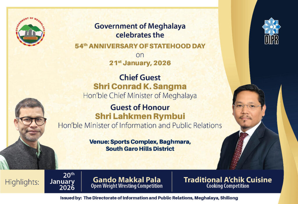Baghmara, Jan 21: Ka Meghalaya hynne ka sngi Balang, kala rakhe ia ka jingdap 54 snem ka jingioh la ka jylla kaba la pynlong ha Baghmara ha ka sien kaba nyngkong, da kaba phaikhmat sha ka South Garo Hills bad ai burom bad pynsahnam ia u kpa uba la seng ia ka jylla bad u Myntri Rangbah ba nyngkong eh ka jylla u (L) Captain Williamson A. Sangma.