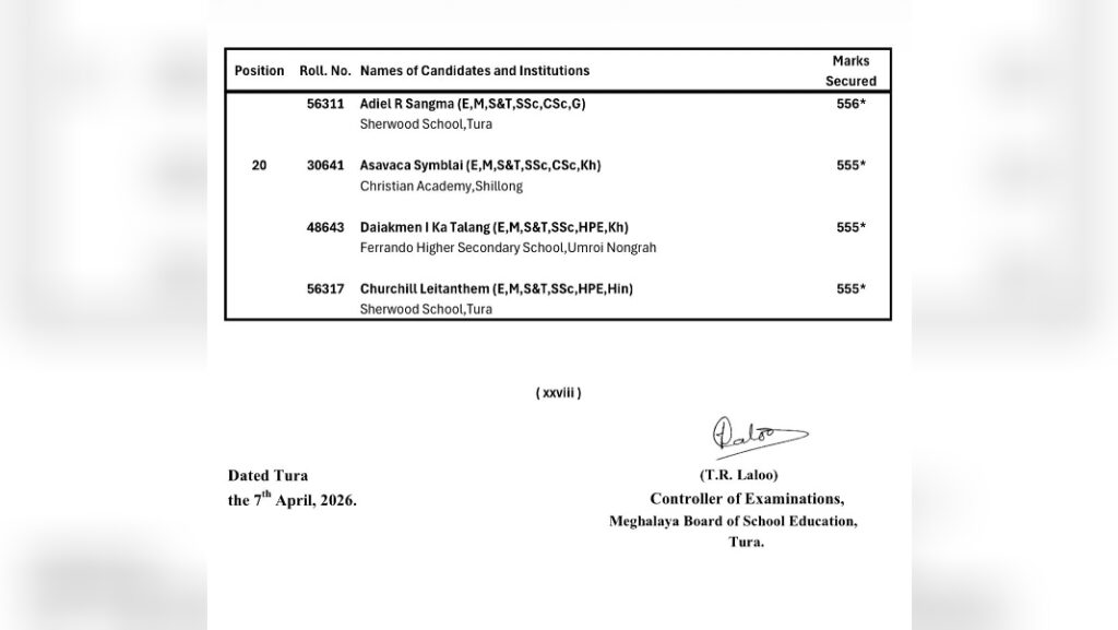 Shillong, Iaiong 07 : Ka Meghalaya Board of School Educaton (MBoSE) ha ka sngi Ba-ar, kala pynbna ia ka result jong ka eksam Secondary School Leaving Certificate (SSLC), 2026, kaba ka jingpass jong ki khynnah ka kot 86.84%, kaba duna khyndiat ia ka result u snem bala lah kaba kot 87.10%.