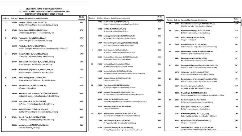 U samla Waangal Lama jong ka Gorkha Pathshala Higher Secondary School, Shillong, ula ioh ia ka kyrdan ba hakhlieh duh da ka jinglah ban ioh haduh 585 marks. U Vishal Kumar jong ka Embee Rosebud Higher Secondary School, Tura, ula wan ha ka kyrdan ba-ar da ka jingioh 576 mark.