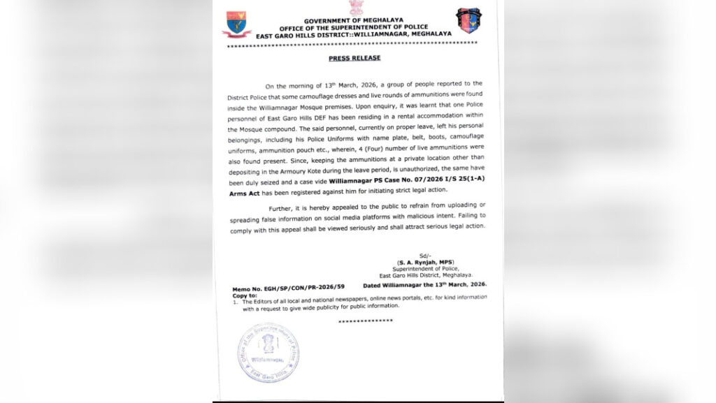 Shillong, Lber 13 : Ka Tnad Pulit kala pynngat case hapoh ki kyndon ka Arms Act pyrshah ia uwei u Pulit hadien ka jinglap ia ki kuli bad ka uniform hapoh ka jaka sah wai ba don ha phyllaw ka Mosque ha Williamnagar, East Garo Hills.