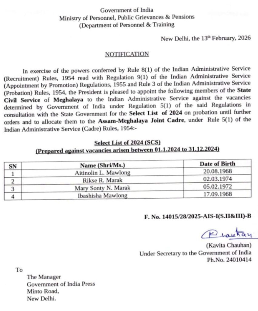 Kat kum ka jingpynbna bala pynmih da ka Under Secretary ka Ministry pf Personnel, Public Grievances & Pension (Department of Personnel & Training) ha ka 13 tarik Rymphang, 2026, ia kine ki Ophisar lah thung ha ki kam ba lait hapdeng ka 1 tarik Kyllalyngkot haduh 31 tarik Nohprah, 2024.